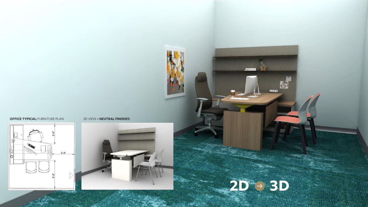 After we present 2D layouts to confirm all required functions and clearances are met, we then show 3D views to help you visualize how the product will look and ensure all furniture style selections and finishes meet the end user’s needs and expectations.