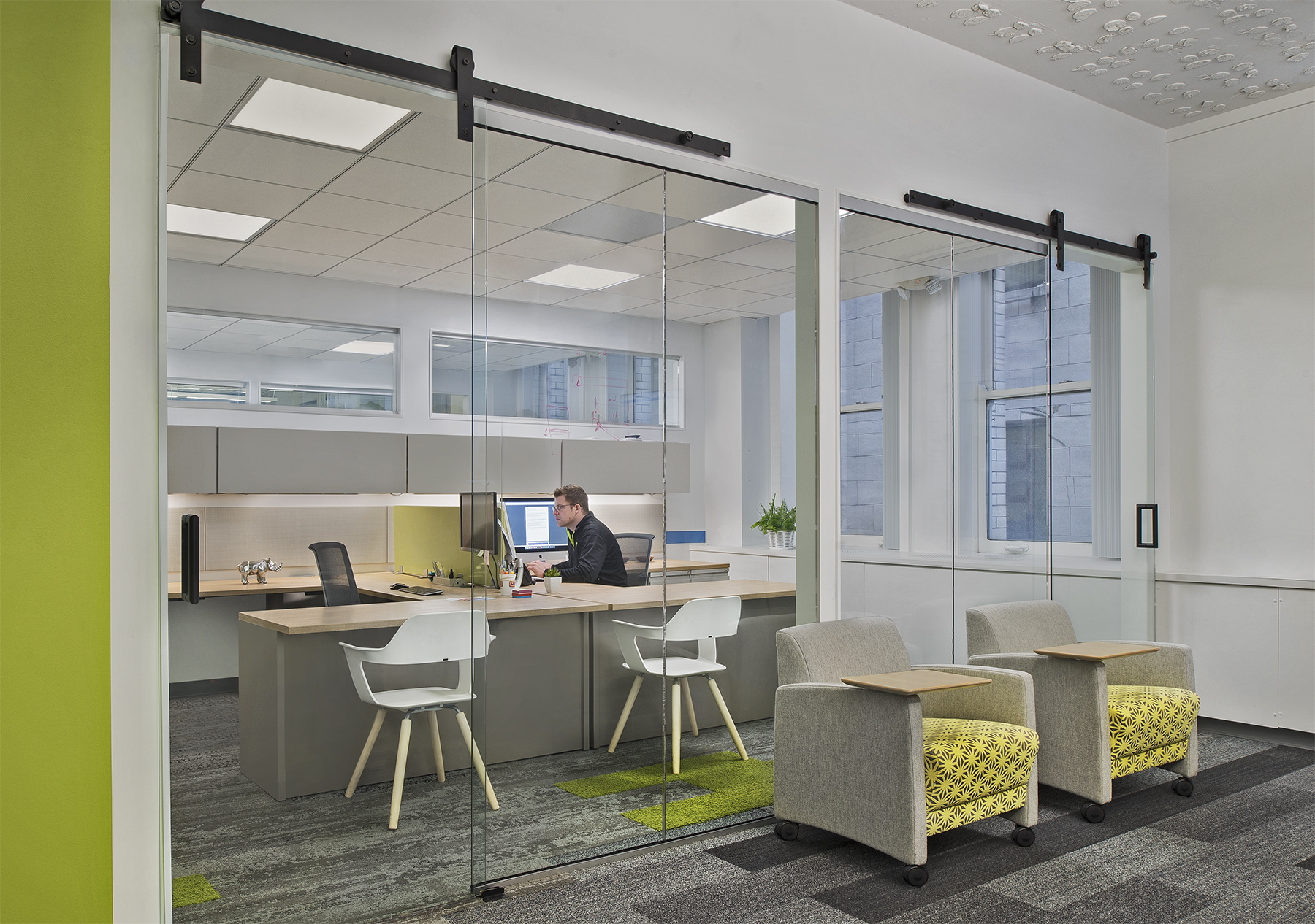 Detroit-based GreenLancer, a startup engineering consultancy for the solar energy industry, was growing quickly and needed to move into a larger space. The layout did not reflect their company culture, with a hodgepodge of different furniture types and exposed dangling wires. Due to the growth of the business, the single conference room was over-utilized and insufficient for how they function.